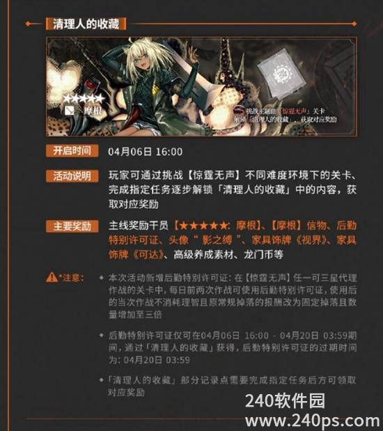 2、后勤特别许可证仅可在04月06日 16:00 - 04月20日 03:59期间,通过「清理人的收藏」获得,后勤特别许可证的过期时间为:04月20日 03:59
