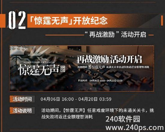 活动说明:活动期间,玩家在【惊霾无声】中任意难度下的未通过关卡,挑战失败将会返还全部的理智。