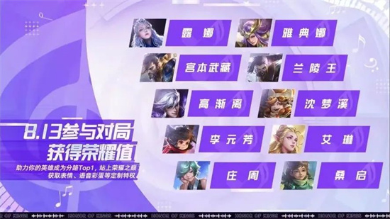3.8月13日0时至23时59分59秒期间,进行5V5匹配(非人机且6分钟以上的对局)、5V5排位、巅峰赛比赛,获得金牌、银牌、获胜和非获胜均可为所使用的英雄增加荣耀值