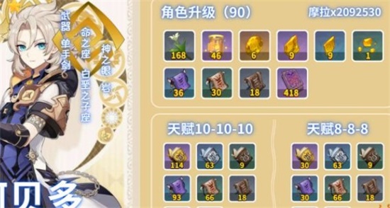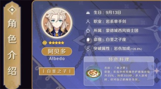 阿贝多是一个岩属性后台挂E后台副c及辅助角色,等级天赋突破素材需要塞西莉亚花、吞天之鲸·只角、玄岩之塔、坚牢黄玉系列、绘卷系列、诗文系列。塞西莉亚花可以采集、芙萝拉处购买以及尘歌壶种植。