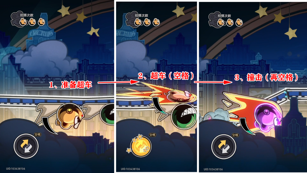 操作:超车(按空格)——>成功超车(周身发光)——>撞敌人(再按一次空格),所以相当于连续按了两下空格