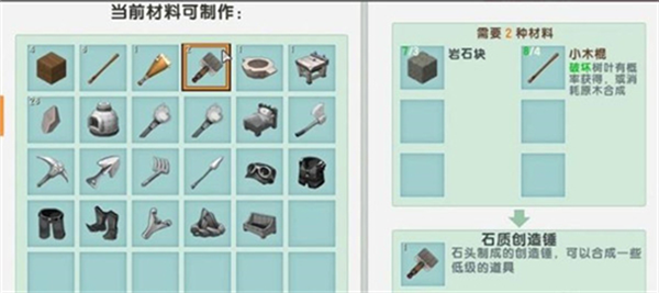 1、首先玩家需要准备3个岩石块、4个小木棍,并合成石质创造锤。