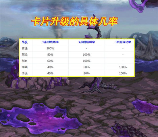 目前传说卡片的升级模式:放入1~3张卡片,成功率分别会显示中、高、确定。为何没有“低”呢?原来升级卡片的成功率跟“品级”和“胚子卡数量”都有关系。比如粉卡和传说卡,放入1张胚子卡之后,就有40%成功率!2张更是高达80%,难怪不少玩家表示2张几乎必成。