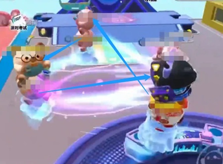 第二步,摆好阵型后,由下面一位蛋仔向前方另一组的最上面一位蛋仔使用幽魂追踪,其他两组也是同样的操作将三组通过幽魂追踪联结起来,如箭头所示: