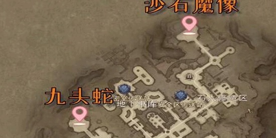3、然后找到九头蛇的位置,如下图所示,该地区有两个boss,一个是九头蛇,一个是沙石魔像。玩家想要遇见九头蛇还是需要看运气的,如果第一次灭有遇到,可以多收集残页,多开几次书。