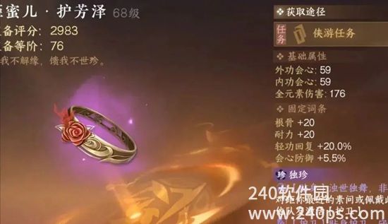 意气相倾:是好友度达到201,大家这两天好感度赠送的次数留一留,到时候送一送很快就能达到了。到时候做完侠游任务《无处可逃》,就可以获得这件76级独珍装备【姬密儿.护芳泽】了。