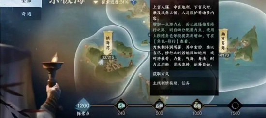 03、三本虎衿经获取:1)第一本开大宝箱获取,坐标(1880,1440)就是逍遥门木桥桥头那棵大树上。2)第二本开大宝箱获取,坐标(1908,764)在山顶屋子的走廊里。3)第三本是东极海探索点达到500点可以获取,这个难度不大,很快到的。