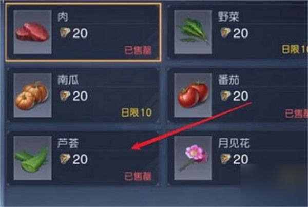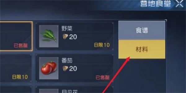 2. 另外,我们还可以在二级营地的食堂中购买芦荟。只需点击材料选项,就能找到芦荟,并以20金币的价格购买。
