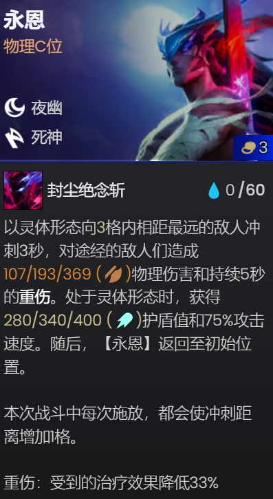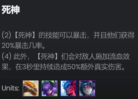 而死神羁绊能让永恩技能有暴击,4死神下还有额外50%流血真实效果,大幅度增加输出强度。