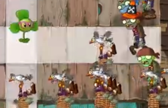 3、海盗港湾:因为三叶草是鸟类的克星,像海鸥僵尸、鹦鹉僵尸、飞索僵尸等都只需用一个50耗阳光、快速恢复的三叶草抵消掉,所以靠三叶草通关能大大降低关卡难度。