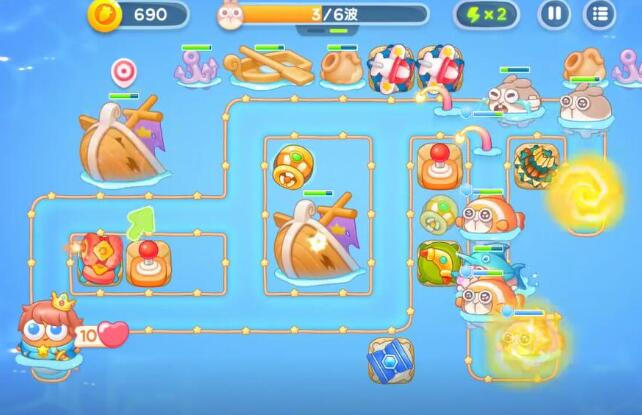 1、利用第一轮提供的防御塔清理障碍物对兔子进行输出,同时在中间和偏右的地方建造两个鱼雷,准备应对潜水的兔子。