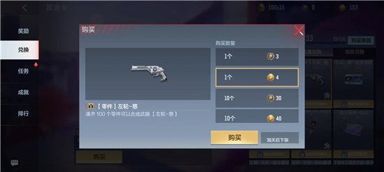 左轮-慈在本次S4赏金令兑换商城返场,达到黄金500级解锁兑换,消耗4赏金币/3黑金币可兑换一个零件,集齐100个零件合成。对零碎片玩家而言,这个兑换价格较昂贵,同样条件下兑换TAC-慈无疑更具性价比,推荐已收集大部分零件和想凑齐慈套装的收藏党入手!