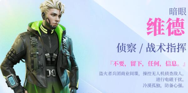 维德是雇佣组织盗火者兵团的成员之一,主要是通过接取秘密任务来获得赏金,他的身手了得,而且思维敏捷且缜密。被动技能为信号定位,还有另一个被动叫做信息共享,就是维德能够看到的信息可以同步给到队友,比如让队友也能够看到无人机,普通技能叫做侦查无人机,在使用这个技能的时候维德可以拥有一台无人机,这台无人机可以让它自由对周遭进行侦查,或者是停留在某个地方。