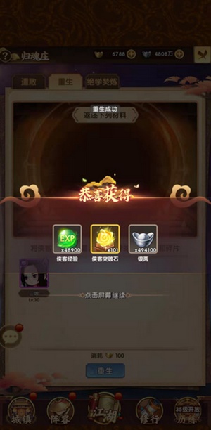 换下来的主角侠客,就可以在主界面上的归魂庄中进行重生,在重生里选中主角侠客,然后消耗一百枚元宝就可以了。重生之后可以返还培养主角侠客的所有花费,所以很多玩家觉得主角侠客属性太差,不舍得去培养,现在有了这个功能之后,前期所有的培养花费都能够回来了,所以大家放心的去培养就可以了。