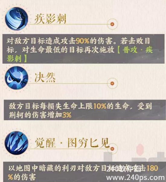 2、高渐离,天命技能[易水决],荆轲[觉醒.图穷匕见]无视敌方目标10%的防御。