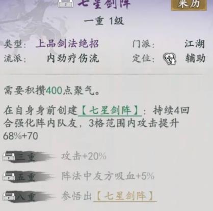 七星剑阵,队友芊芊自带,第一次启动后就是四回合的无缝范围攻击力强化,三重88%,五重吸血看似很少,实际上叠加①②和他自身的增幅,相当于普通武学5*1.5*2*1.9≈30%的吸血强度;但这并不是极限,因为这是队友的武学。