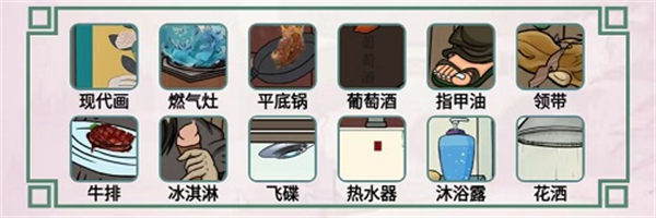 现代画、燃气灶、平底锅、葡萄酒、指甲油、领带、牛排、冰淇淋、飞碟、热水器、沐浴露、花洒
