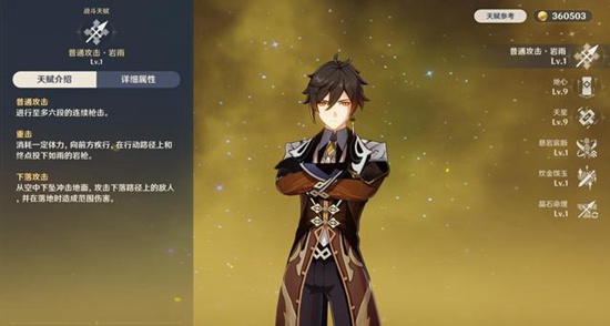 普攻9段伤害,9级总倍率442.8%,一套普攻总耗时3.167秒,其中第5-8段的踢枪动作是脱手输出。重击对直线路径上的敌人造成1次伤害,9级倍率204%。