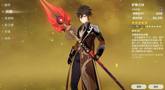 钟离的圣遗物可选苍白4、苍白2+骑士道2、流星4、追忆4;武器可选【护摩之杖】、【和璞鸢】、【贯虹之槊】、【千岩长枪】、【决斗之枪】等;属性选攻击沙+物伤杯+暴击/暴伤帽。