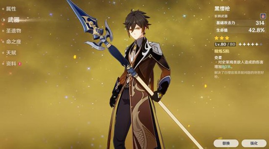 盾辅流的钟离,武器选【黑缨枪】,圣遗物选千岩4,属性上尽全力堆生命值。