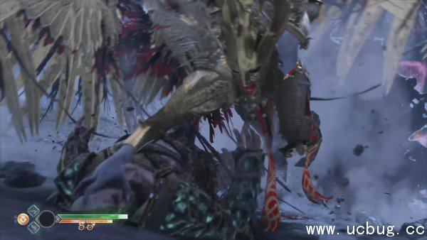 有很多火属性攻击,用翅膀二连斩之后会接三种模式的攻击。一种是有多段攻击的原地回旋,一种是不可防御的冲刺拳,最后一种是用法杖打目眩效果的攻击,不过威胁都不大,好好接下翅膀二连斩之后闪避就行。投射羽毛之后有很大几率冲刺上来。