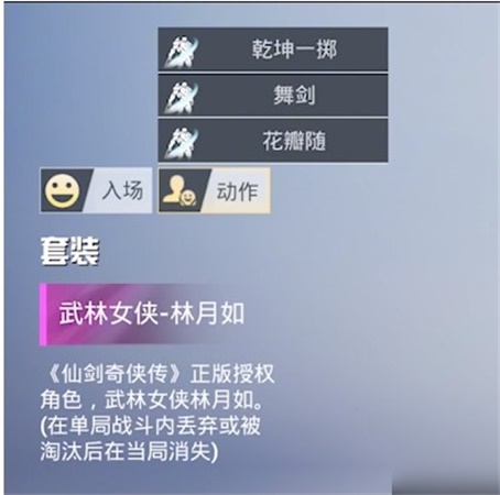 外观未知,动作有乾坤一掷、舞剑、花瓣随。