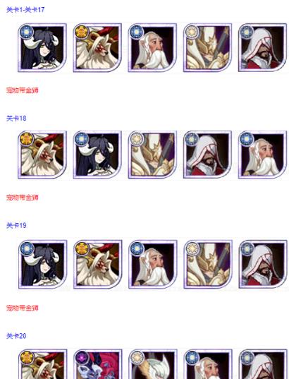 1、关卡1-17使用一下阵容,佩戴宠物金狮,18-19用其他阵容,宠物也是金狮。