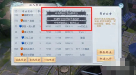 6.“一键申请”可以申请多个帮会,申请入帮快一些。