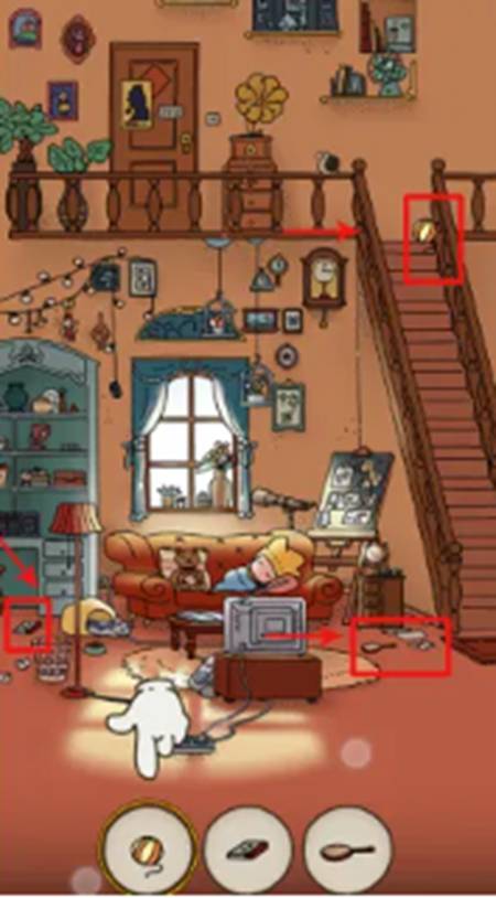 2.接着可以楼梯口找到球,楼梯下方找到放大镜,柜子前方找到录音带。
