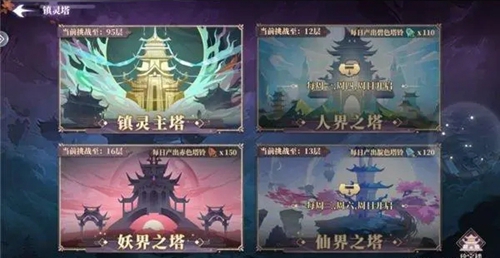 首先要明确的是,镇灵塔实际上共分为四座,分别为镇灵主塔,人界之塔,妖界之塔,仙界之塔。当镇灵塔主塔进行到一定层数时,其余三座镇灵塔会同时自动开放。