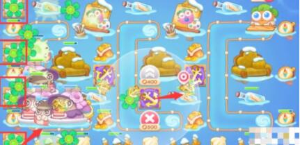 1、这一关最好是有范围输出炮塔和减速炮塔玩的会比较稳妥,推荐选择:风扇、飞机、船锚、魔法球、鱼刺等作为主力输出。