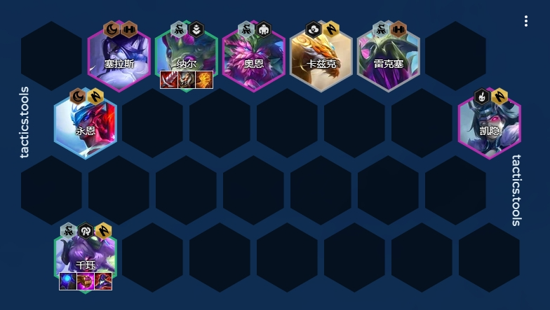 千珏虽然被削弱过了,但是开高死神情况下伤害也是不错的,目前算是比较简单的低费赌狗阵容,玩法简单就是六级不断D两个二费永森三星,然后利用不断成长去战斗,后期强度也是有的,因为永森血量成长后面会非常高,能上九挂腕豪也是非常大的提升,上不去九的话8级挂塞拉斯也是不错的选择。