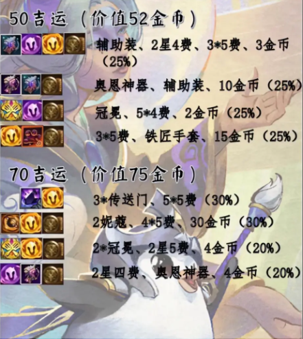 奖励:辅助装、2星4费、3*5费、 3金币(25%)、奥恩神器、 辅助装、10金币(25%)、冠冕、5*4费、2金币(25%)、3*5费、铁匠手套、15金币(25%)