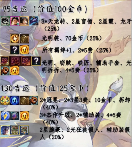 奖励:3*天龙转、2星盲僧、2星霞、龙牙(25%)、光明装、70金币(25%)、所有羁绊+1、2*5费,(25%)、光明、窃贼、铁匠、辅助手套、光明拆拆、4*5费(25%)