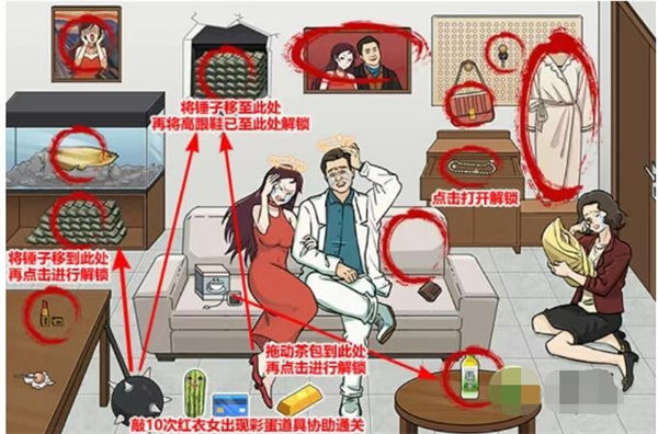 彩蛋提示:拖动锤子敲击红衣女6次可以弹出特殊道具,敲击3次弹出西瓜条(价值6),敲击6次弹出银行卡(价值100,000),敲击10次弹出金砖(价值400,000)。