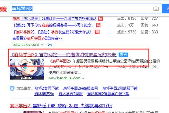 1、在电脑的百度上输入崩坏学园2,找到其网站以后点击进入。
