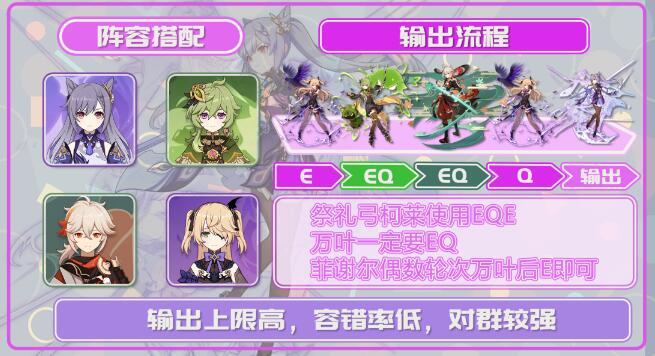 刻莱钟菲为一支短轴爆发队伍,刻晴与雷系副c打激化反应,柯莱负责后台挂草保证激化反应的覆盖率,钟离负责提供较高的容错率。