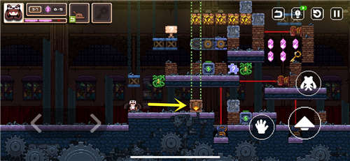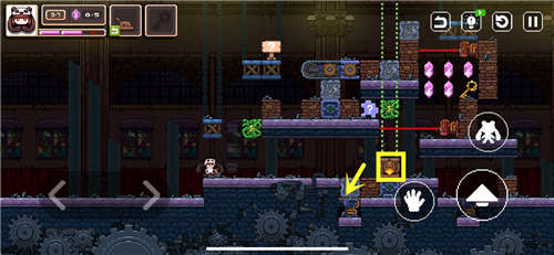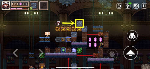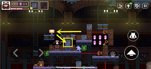 推回标记箱子用来垫脚,跳上去把破碎的箱子推到图示位置压住机关。