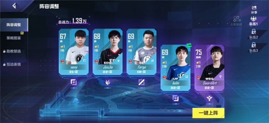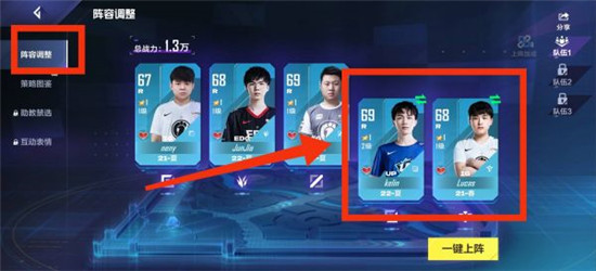 2.进入备战界面后,点击左侧的*个选项“阵容调整”,可以看到自己队伍阵容,选手卡片上有绿色箭头的就代表可以调整上阵,选择想要换掉的选手,并点击其卡片(以Lucas为例)。如下图所示: