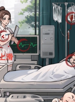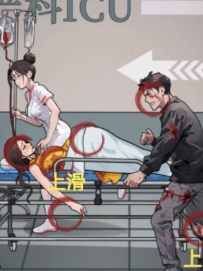 2、来到场景二找出5处异常的地方,分别是护士衣服上的血迹、心率仪上的心率太慢、输血袋、戴呼吸面罩的女子、上划护士的口袋找到病危通知书。