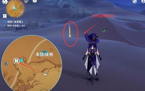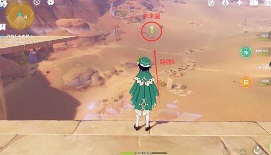 3.我们来到丰饶绿洲下方的传送点,按照下图路线向地图西北方行走,悬崖边缘即可看见未来星的踪迹。
