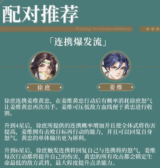 解析:这是一套连携爆发流的阵容,能够让姜维黄忠行动后消耗徐庶怒气,再起行动,压低血线后让黄忠进行收割。