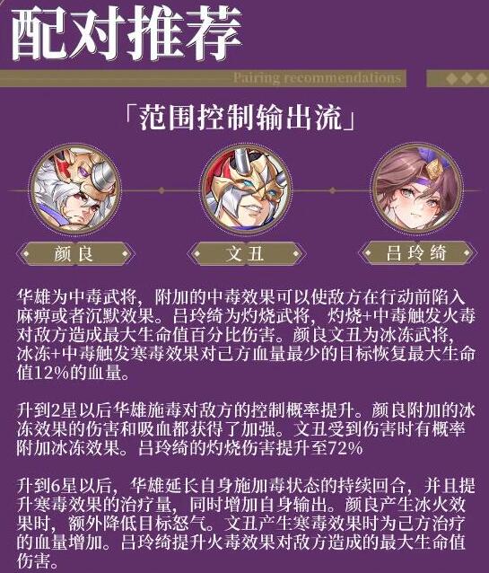 解析:这套为范围控制输出流,通过华雄的中毒来让敌人陷入控制,再与吕玲绮的灼烧打出火毒的百分比伤害,颜良文丑还能触发寒毒,恢复己方英雄血量。
