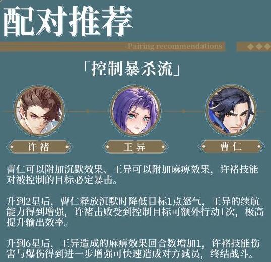 解析:这是一套控制暴杀流的阵容,通过曹仁与王异的控制,让许褚对被控制的敌人打出爆炸的输出。