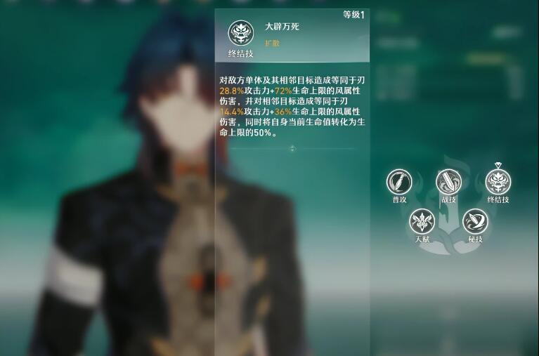 对敌方单体目标造成基于刃攻击力比例提升的风属性伤害,没什么好说的。