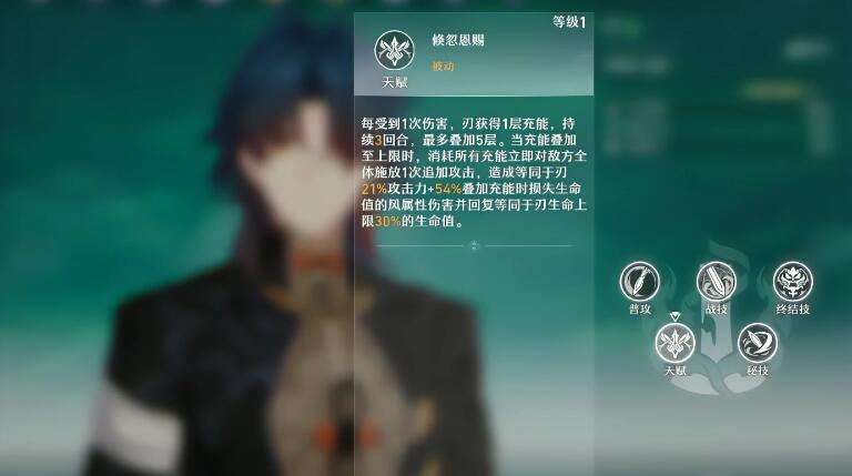 释放后普攻会强化为群攻,且增加造成的伤害,持续三回合。但释放后会降低30%的生命值,虽不会导致刃死亡,却也会让生存压力暴增。同时地狱变无法恢复终结技能量,所以刃的充能也需要注意。