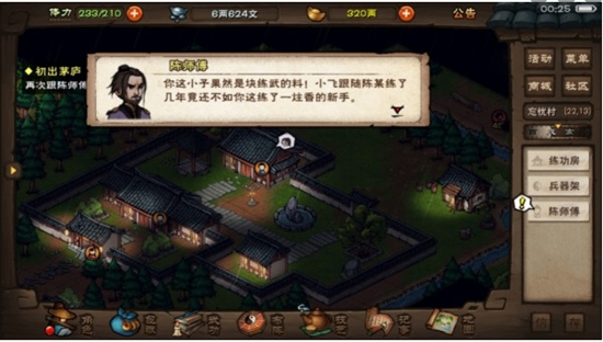 2、之后找到“陈师傅”,买烧刀子学武,之后与NPC小飞比武。