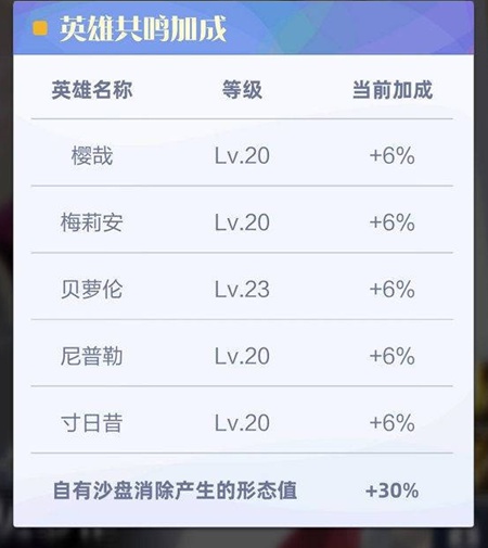 英雄之间有【共鸣】可以对我们沙盘的【形态值】加成,也是提升战力的一个重要因素。每一个英雄的升级都会提供共鸣加成,不用担心浪费资源~