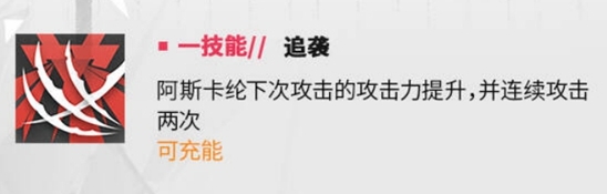 技能开启时,阿斯卡纶的攻击力提升,使攻击范围内地面敌人移动速度降低,并在其被击倒时对周围敌人施加一层第一天赋效果。