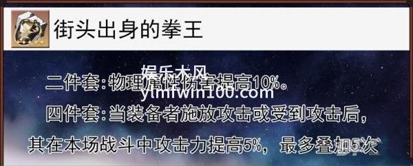 四件套:当装备者施放攻击或受到攻击后,其在本场战斗中攻击力提高5%,最多叠加5次。